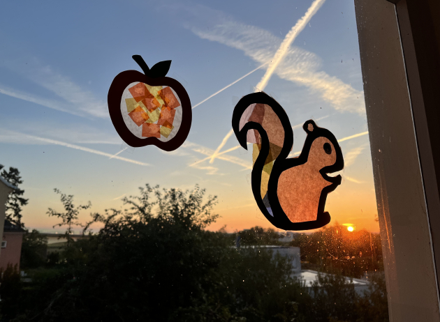 Besonders schön ist es, wie unsere Fensterbilder mit dem Sonnenlicht spielen: Wenn die Sonne aufgeht, leuchten Apfel und Eichhörnchen in warmen Farben und werfen ihre Schatten an die Wand - ein kleines Kunstwerk der Natur, das uns jeden Morgen verzaubert.
